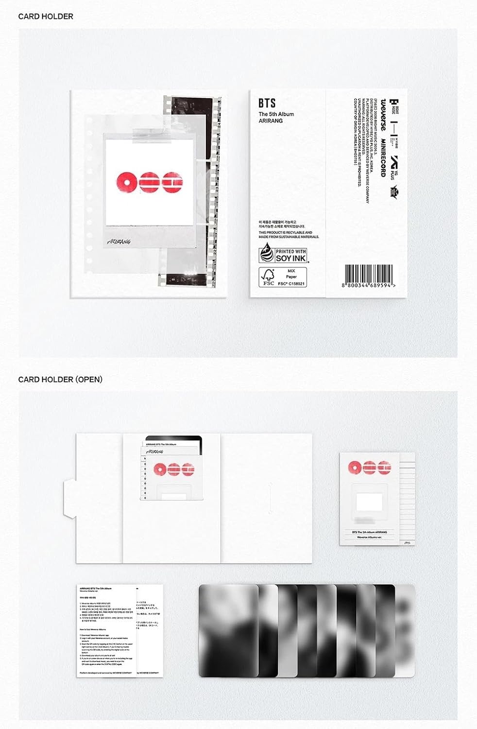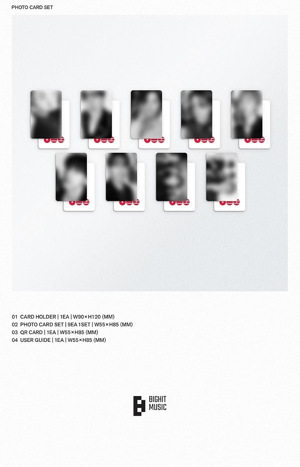 Set album bao gồm: 1 kẹp card, 1 set 9 photocard, 1 QR card (ngẫu nhiên 1 trong 4) và 1 thẻ hướng dẫn sử dụng.